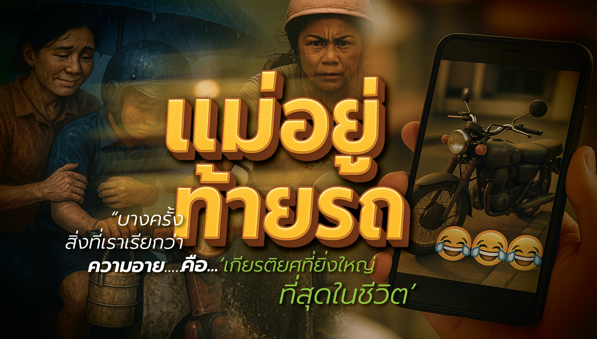เด็กชายคนหนึ่งอายที่แม่ยังมาส่งด้วยมอเตอร์ไซค์เก่า จึงให้แม่จอดไกล ๆ ไม่ให้เพื่อนเห็นแม้แม่จะตื่นเช้า หุงข้าว เตรียมปิ่นโต และขี่รถมาด้วยความรักเสมอ เสียงหัวเราะของเพื่อนกลายเป็นบาดแผลที่ทำให้เขาผลักไสแม่ จนวันที่ฝนตก แม่คือคนเดียวที่ยังกลับมารับ พร้อมยอมเปียกแทนเขา วันนั้น เขาจึงได้รู้ว่าแม่คือเกียรติยศที่ยิ่งใหญ่ที่สุดในชีวิต.